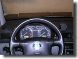 1) Volant nastavit do polohy k řidiči a dolů. Obě plastové krytky (nahoře v krytu palubní deskty) odstanit ostrým nástrojem př. šroubovák a vyšroubovat Torx-šrouby (TX 20). Ochraný kryt sloupku řízení není třeba odstranit.