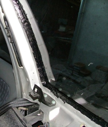 Po tejto demontaži som mal okno prístupné z vnutorněj strany. Zistil som, že je tam dostatok priestoru (medzi sklom a karoseriou) na natlačenie dalsej vrstvy lepidla. Preto som zvolil variantu iba podlepit a nevyrezavat cele okno a znova cele nalepit. Kedže okno relativně držalo dobře v miestach kde je okrasná lišta, vobec mi nezatekalo!?! iba pri zatlačení na okno z vnutra pružilo, rozhodol som ze ho iba zpevnim.