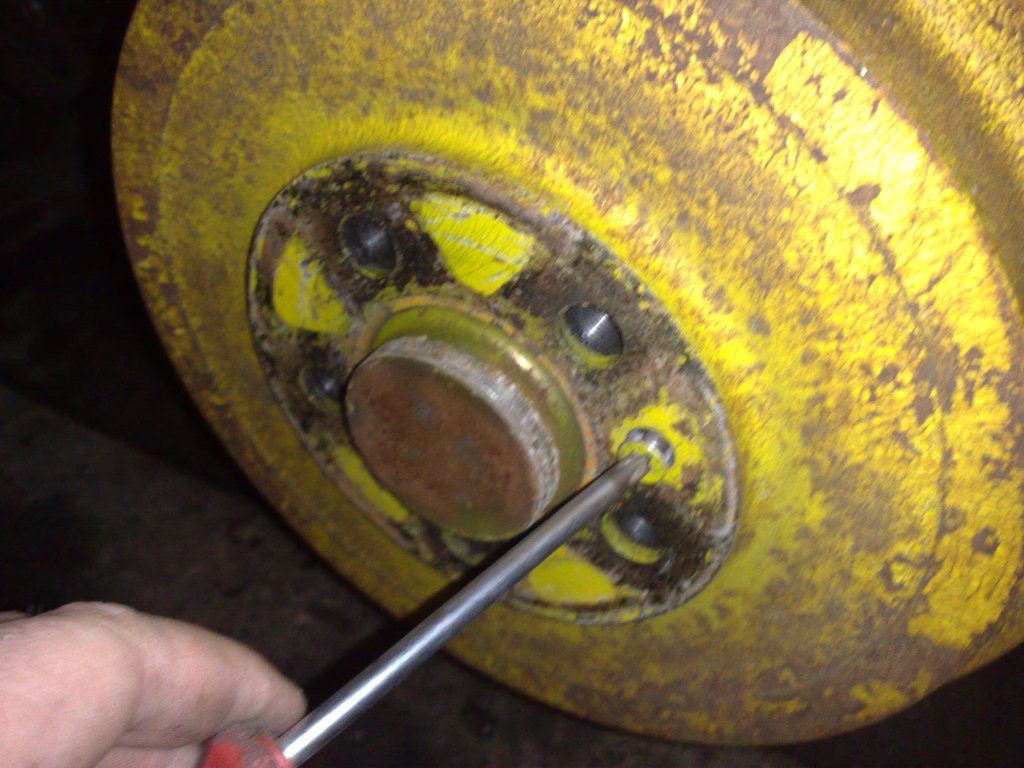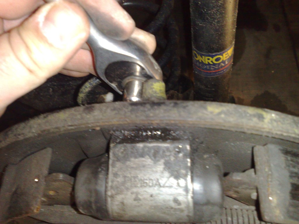 Poriadne obúchajme bubon aby čeľuste sadli na miesto späť. Ak ste trpezlivejší a šikovnejší ako ja, môžete skúsiť nájsť nastavovaciu tyčku tak, že cez diery šróbov kolies ju nájdete v ľavej časti / t.j. smer k predku auta /, prípadne si nasvietite, a keď ju vidíte, šróbovákom cez dieru ju vypáčite smerom nahor a je to. Začujete cvakot a čeľuste sú v základnom stave.