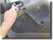 g) S Sundaváme tapec směrem nahoru a odhákneme lanko táhla kliky dveří a vycvakneme