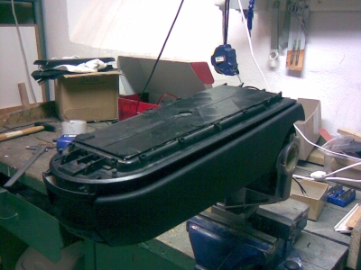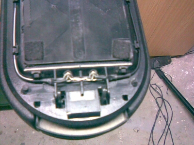 2. "rozpůlit" vrchní čalouněný kryt, POZOR nejlíp začít z obou boků, pak zepředu u západky, páčit tenkým šroubovákem, jde to ztuha, ale jde. Vzadu nepáčit nahoru! Po odcvaknutí vpředu a na bocích vysunout horní díl s čalouněním dozadu