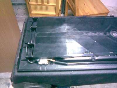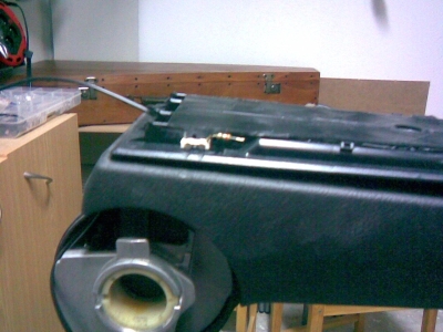 5. na vhodném místě vyvrtat otvor a protáhnout dvojlinku, vrtal jsem mezi panty, kabel jde uvnitř schánky podél pantu dozadu dovnitř loketky a pak kolem mechnismu polohování dolů, pod středový tunel