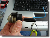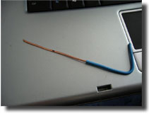 1) Ucvakněte 1,5 mm el. drát. cca 15 cm. z půlky odizolujte na jednom konci 2mm nepatrně ohněte cca 10 st. a na druhém konci ohněte do pravého úhlu cca 3 cm.