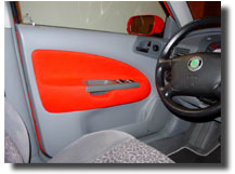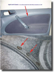 Postup je celkem jednoduchý.Začneme demontáží čalounění což je u octy snadnější než u jiných značek.Na vnitřní straně madla vytlač plastový pásek směrem k čalounění, ten drží madlo, které vyjmeš aodpojíš svorkovnici (ala VW)tahem za přesku, která je barevně odlišená, svorkovnici vytáhneš. Zbývá už jen oddělat ovládání zrcátek a odšroubovat tapec. Neškubat! vysí tam drátek k signalizační diodě imobilizéru(alarmu)Když máš tapec venku jsi už úspěšný na 50% Odloupni poliš a ve svárech odděl od sebe vnitřní díl,který je čalouněný látkou auta. Otřepy, které zůstaly na hlavním díle jsem odstanil ostrým dlátkem aby při lepení díly k sobě dobře přilnuly. Na samotné lepení si zvolíš odstín látky, která je dostupná v materiálu na potahování. Potahová látka musí být velmi elastická aby se dala tvarovat podle madla.Zvolili jsme látku, kterou mi doporučil fancarhifi, od Sinus live a má označení LSB. Má sice jen asi čtyři odstíny červenou-modrou-sv. šedou a černou. Lepidlo bylo použito na čalounění boxů od Dexonu. Dalo by se použít i lepidlo ve spreji, ale to už chce trochu zručnosti. Pozor při nanášení lepidla aby látka někde neprosákla. U námi použitého se dá případné potřísnění odstranit benzínem bez zničení díla. Hotový kus přilepíme zpět k tapecu. My jsme použili stejné lepidlo, ale dá se to slepit čím koliv. No a pak už zbývá zpětná montáž.Z výsledkem budete určitě spokojeni tak jako já.